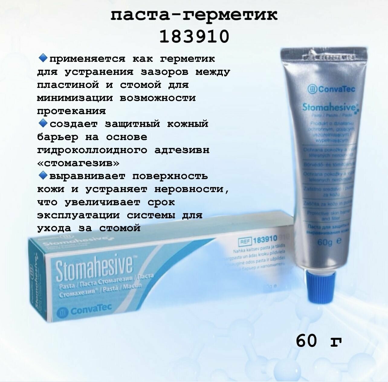 1 штука. ConvaTec паста - герметик Stomahesive для профилактики и лечения раздражений кожи у стомированных людей. Stomahesive паста - герметик способствующая заживлению раздражения кожи и предупреждающая развитие дальнейшего раздражения кожи. Она используется и как заполнитель кожных неровностей вокруг стомы (рубцов, складок кожи и прочих деформаций) для более плотного наложения пластины калоприемника. Пастой «Стомагезив» можно заполнять узкую полоску обнаженной кожи, непосредственно окружающей стому, чтобы этот участок не подвергался агрессивному воздействию кишечного содержимого. Герметизирующая паста обладает высокими гидроколлоидными качествами. При использовании она создает на поверхности кожи влагонепроницаемый барьер, позволяющий избежать повреждения кожи и продлить время применения пластин. Важно: паста содержит небольшое количество спирта, поэтому после нанесения кожу может немного пощипывать. Не волнуйтесь, вскоре это ощущение пощипывания пройдет.Важно: при использовании пластичных пластин риск образования зазоров между контурами стомы и устьем пластины сведен к минимуму.