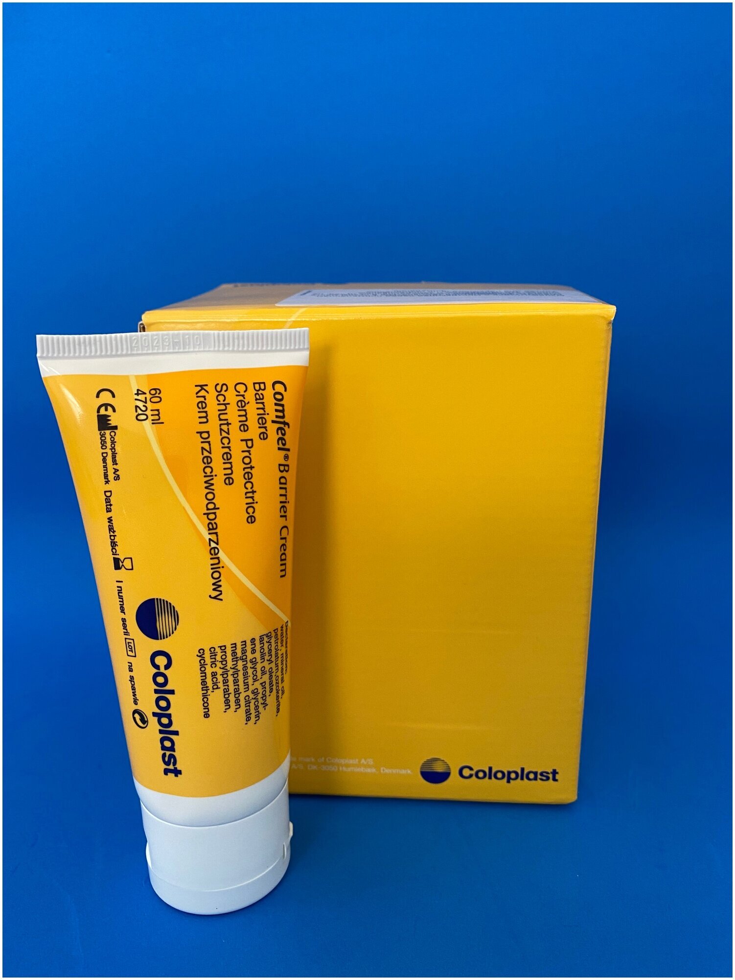 Защитный крем Барьер, Колопласт, Комфил - используется для защиты кожи вокруг стомы подверженной воздействию кала и мочи. Эффективное средство заживления раздраженной кожи и защита сухой кожи. Крем Барьер наносится тонким слоем перед наклеиванием пластины (при необходимости остатки крема удаляются салфеткой), после очищения кожи, и дают крему впитаться в течении нескольких минут. Выпускается в тюбике по 60 мл.