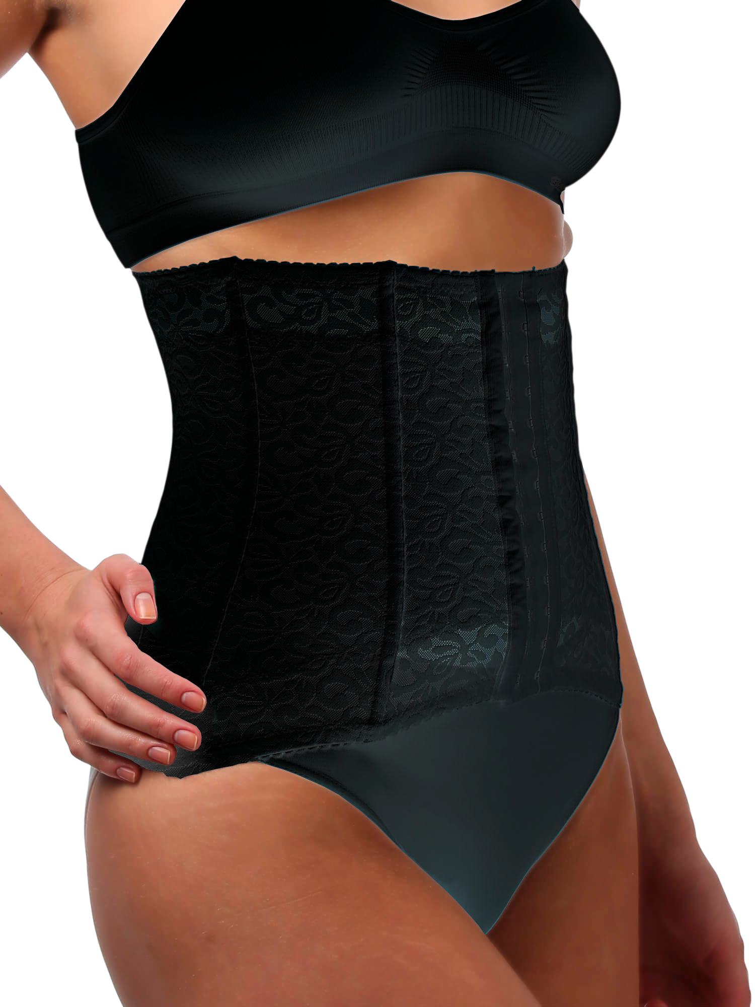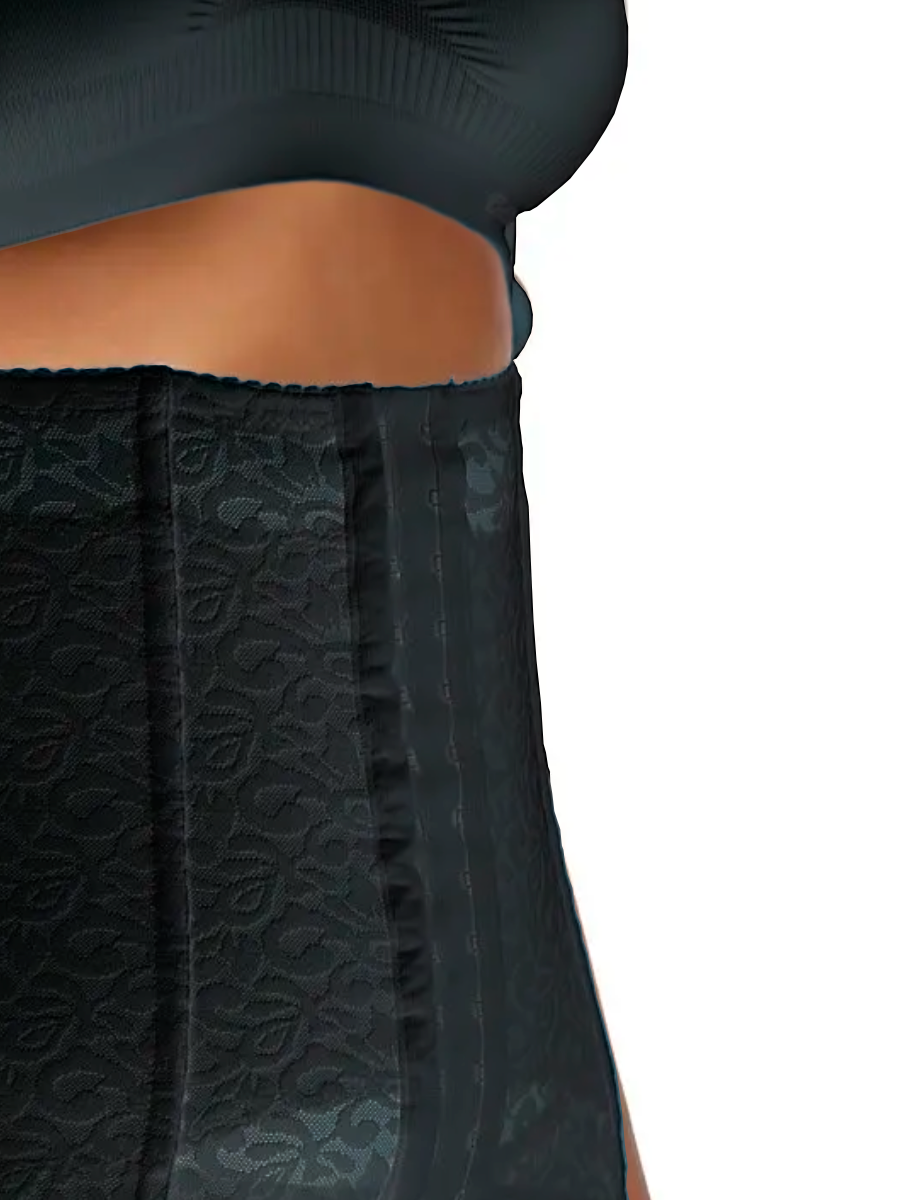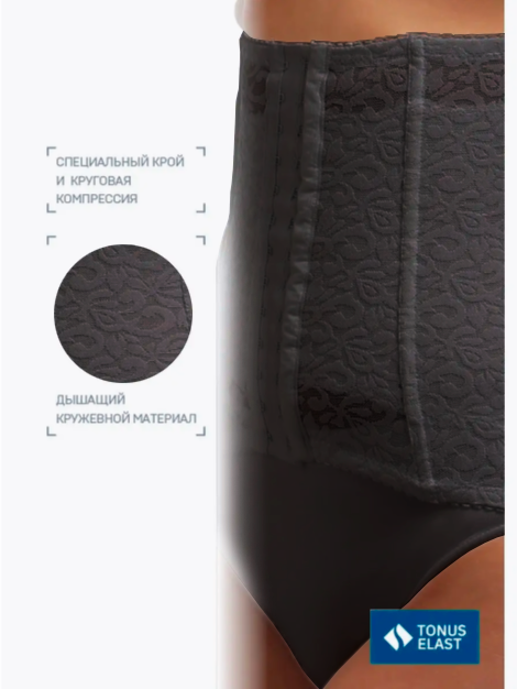 Изделие создает круговую компрессию, а за счет фигурного кроя и 6 вертикальных корсетных косточек подтягивает живот и уменьшает объем талии до 4 см. Внутренний хлопковый слой препятствует раздражению кожи и обеспечивает комфорт при использовании.