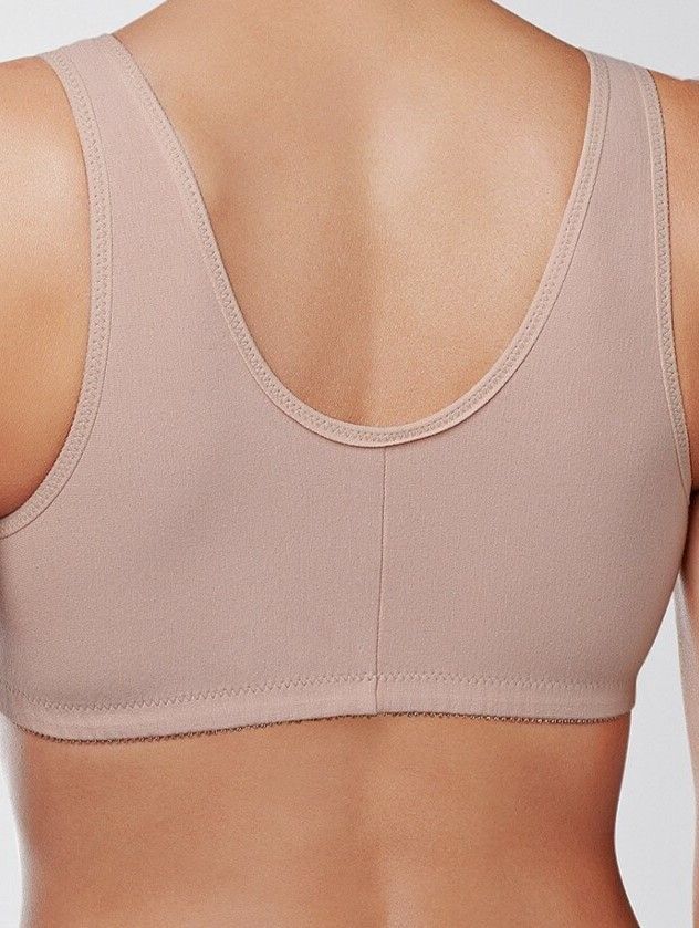 Послеоперационный комфортный бюстгальтер из хлопка в бежевом цвете и фронтальной застежкой на крючках создан специально для женщин, перенесших мастэктомию, помогает чувствовать себя комфортно, надежно и способствует более быстрому восстановлению, возвращению к обычному повседневному распорядку.