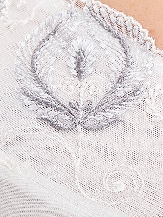 Выразительный рисунок шикарного кружева в виде перьев в верхней части чашечек, ажурный бантик в полоску, обворожительные оборки на бретелях и открытое декольте искусно подчеркнут Ваш соблазнительный силуэт.