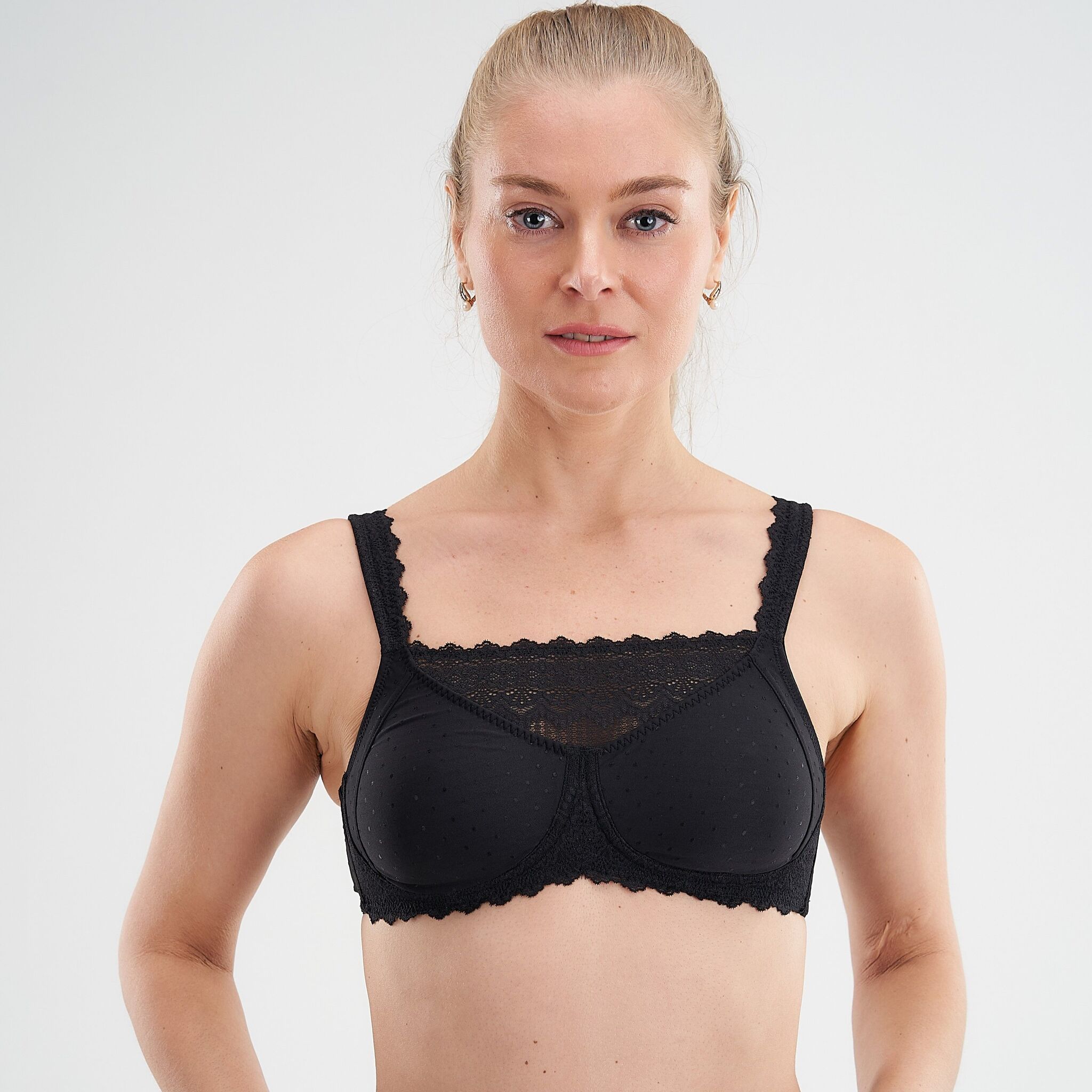 Ортопедический бюстгальтер без косточек Dana Amoena, с кармашками для фиксации экзопротезов или накладок молочной железы, в черном цвете с манишкой, размер 85E.