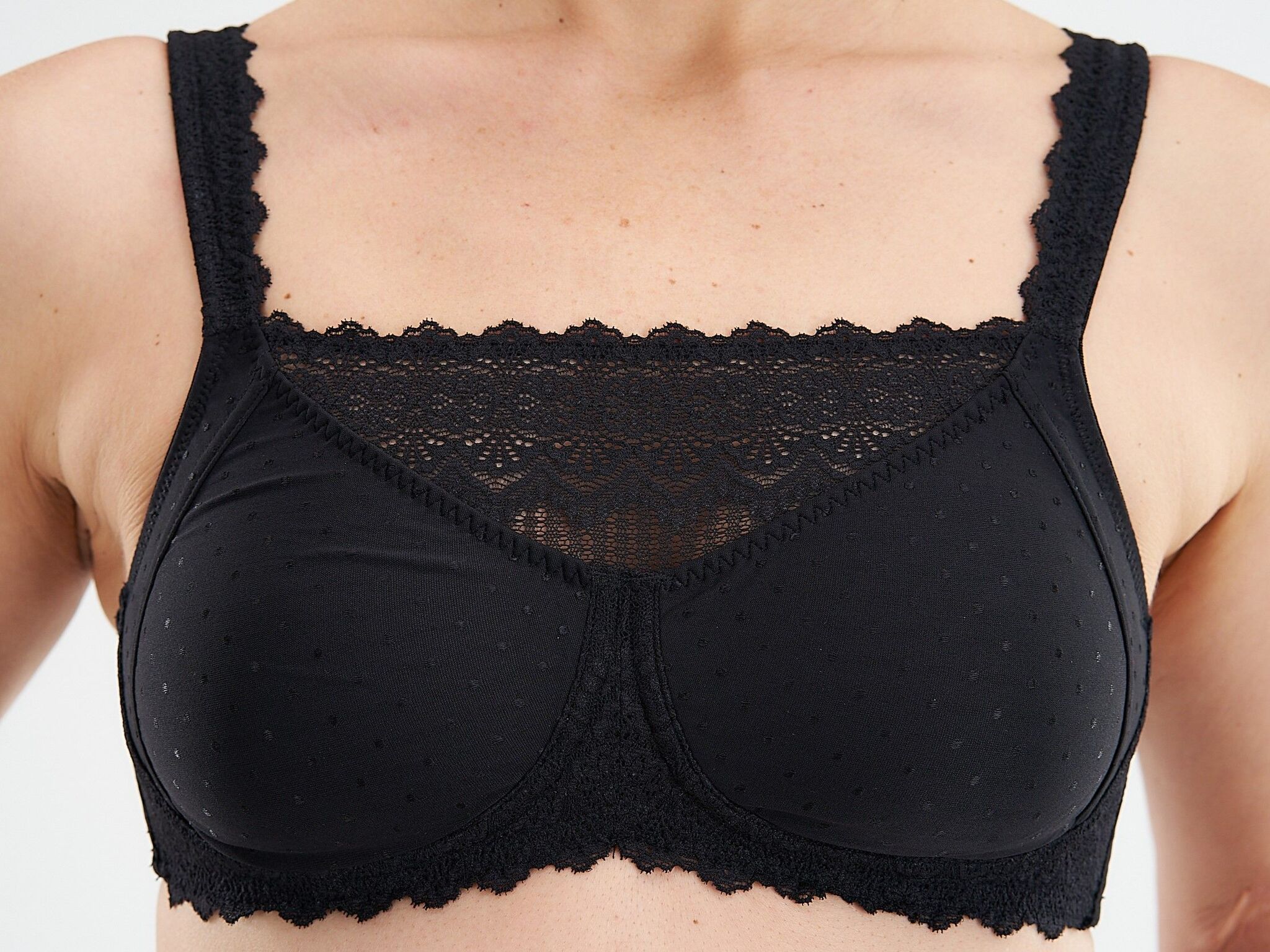 Ортопедический бюстгальтер без косточек Dana Amoena, с кармашками для фиксации экзопротезов или накладок молочной железы, в черном цвете с манишкой, размер 90E.