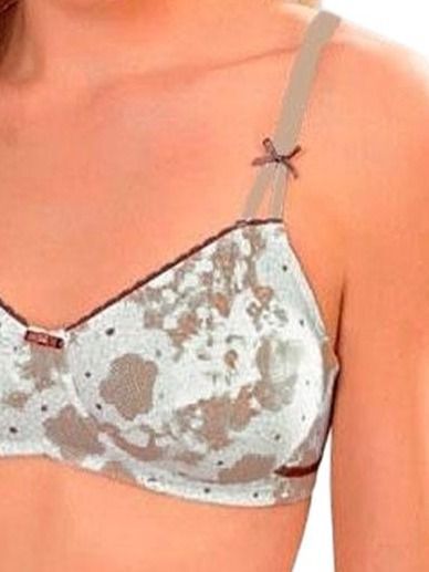 Бюстгальтер выполнен из мягкой микрофибры с "дышащим" эффектом и цветочным принтом, украшен маленькими бантиками бежевого цвета на бретельках, а также нежным изящным кружевом по линии декольте, придавая ему эластичность и плотное прилегание, надежно прикрывая следы операционного вмешательства.