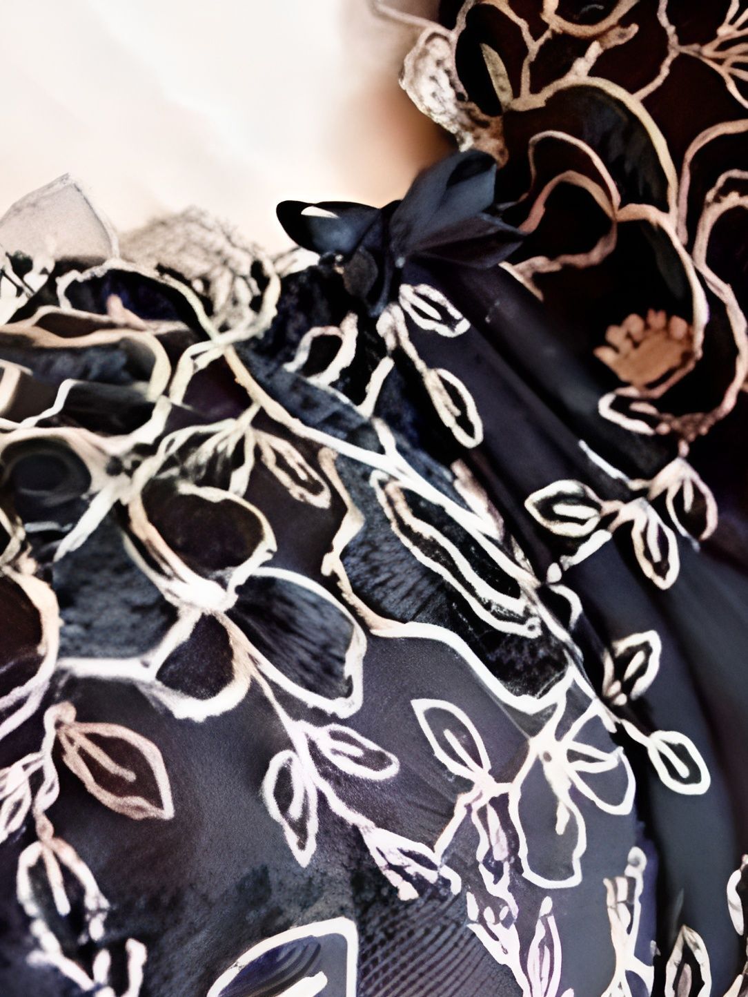 Накладные волнистые кружева изящно обрамляют завышенный вырез декольте, обеспечивая плотное прилегание.