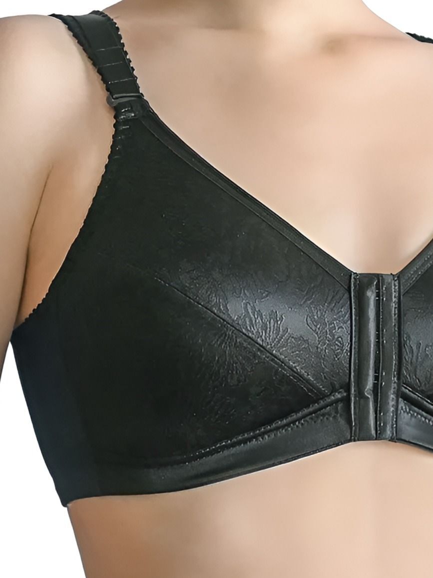 Ортопедический бюстгальтер больших размеров, с передней фронтальной застежкой на 6 крючков, и дополнительной застежкой сзади на 3 ряда крючков, размер 95E, цвет черный, из гладкого однотонного трикотажного полотна с двусторонними кармашками из хлопка для фиксации экзопротезов для женщин после мастэктомии.