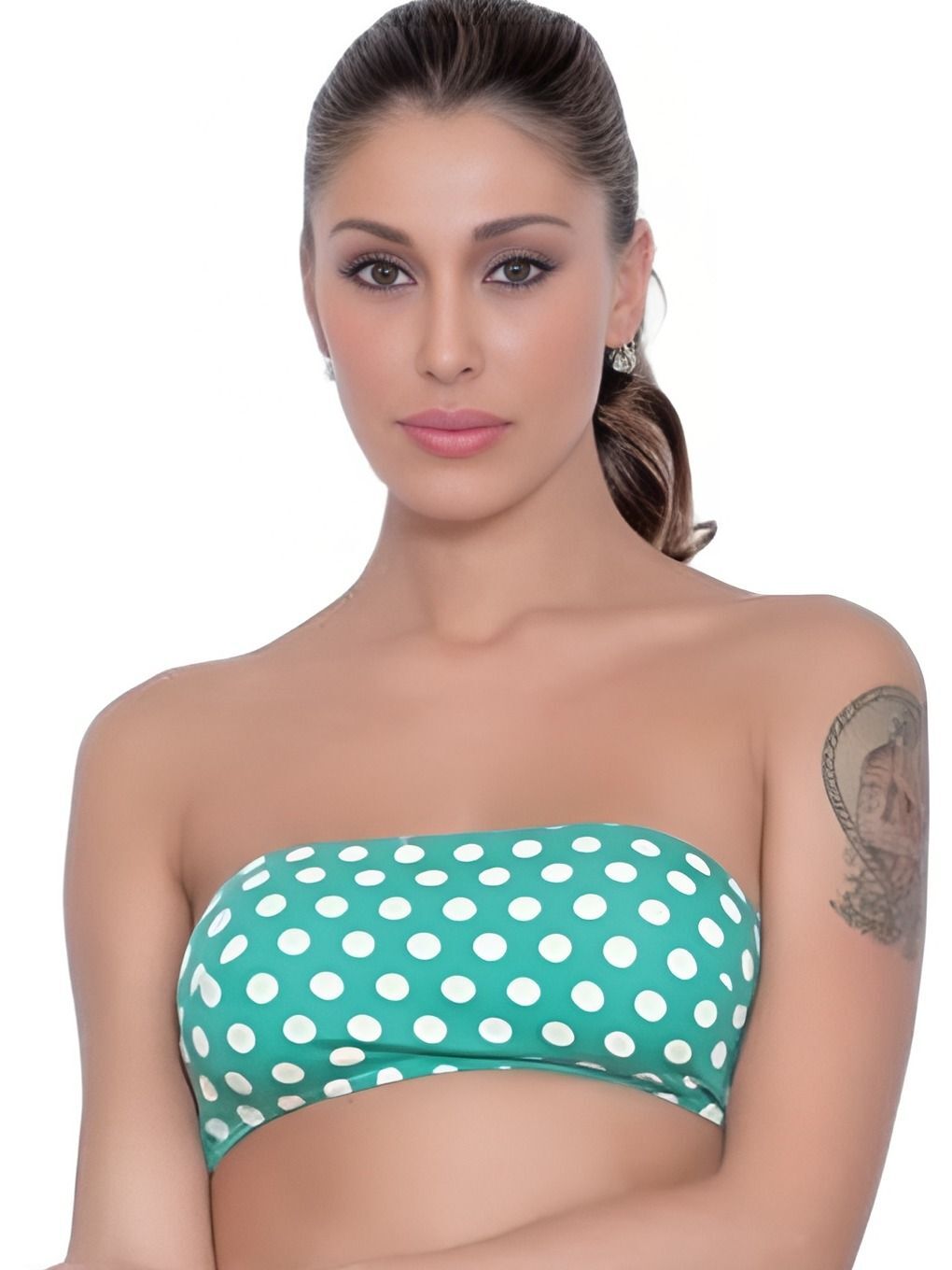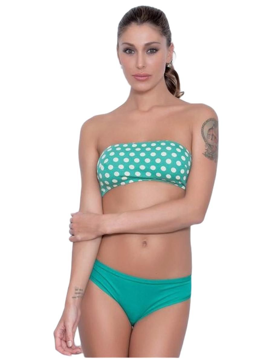 Дизайн топа данного комплекта – всегда модный зеленый малахит «в горошек», трусики – монотонный зеленый малахитовый цвет.