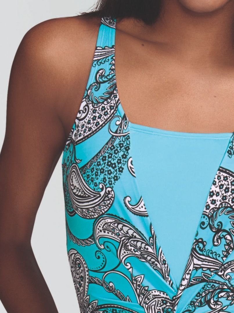 Мягкий встроенный лиф и регулируемые расширенные бретели позволяют отрегулировать высоту зоны декольте. Необычный орнамент на купальнике привносит некую самобытность образу, и отвлекает внимание на зону декольте.