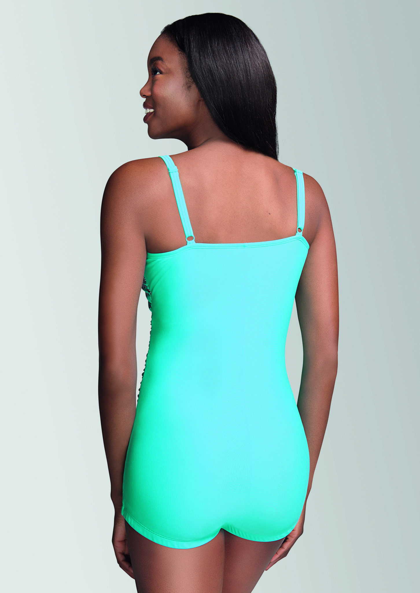 Особый крой и драпировка прекрасно скрывают все недостатки фигуры, а моделирующая бандажная сетка корректирует пропорции силуэта. Мягкий встроенный лиф и регулируемые расширенные бретели позволяют отрегулировать высоту зоны декольте. Необычный орнамент на купальнике привносит некую самобытность образу, и отвлекает внимание на зону декольте.