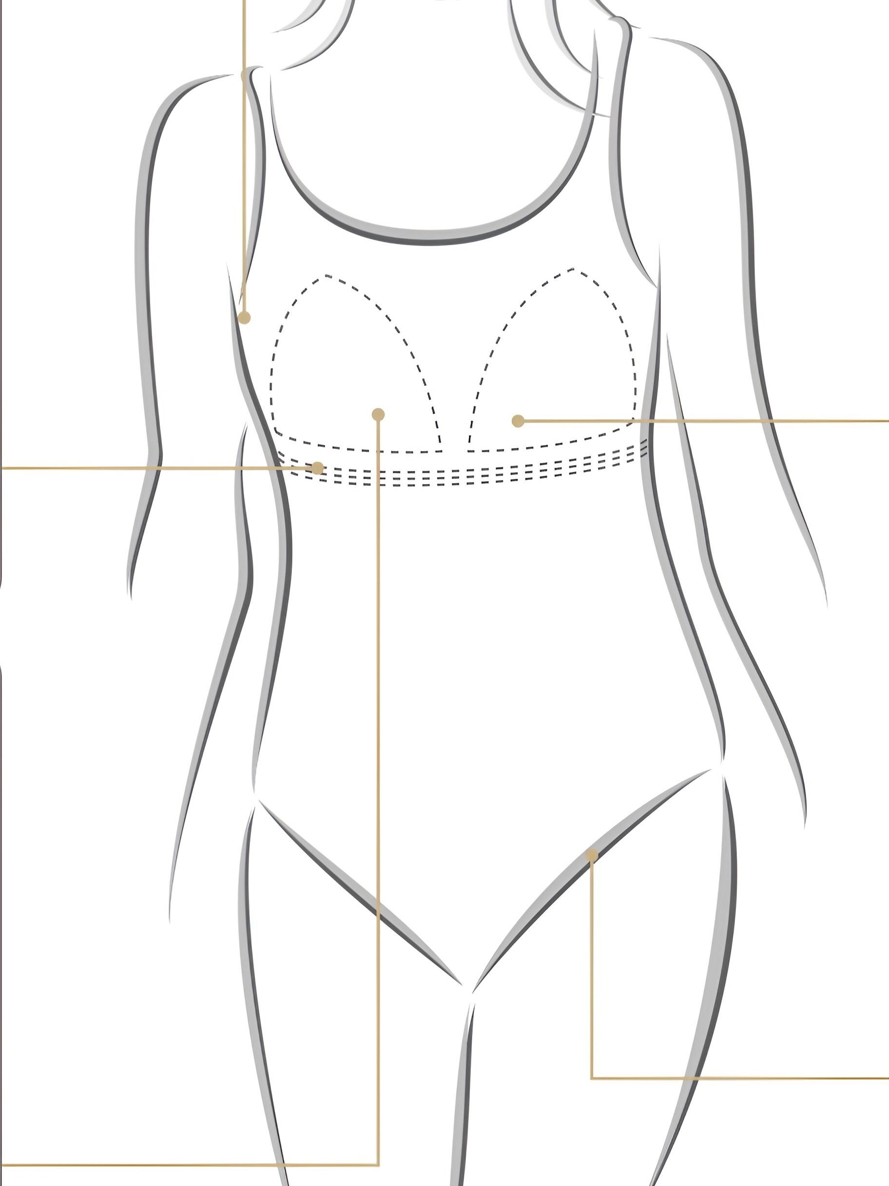 • Облегающее, высокое декольте в сочетании с эластичными материалами и тесёмками обеспечивает надежную фиксацию и поддержку, а также скрывает шрамы;