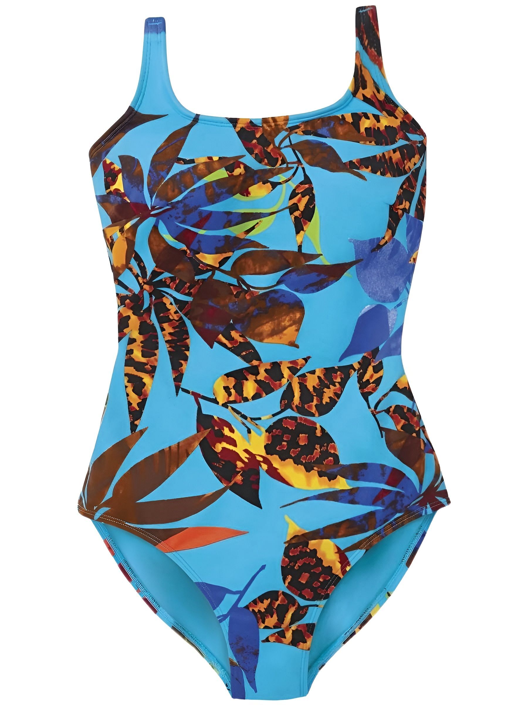 Купальник Amoena слитный, ортопедический, размер 42C.EU / 48C.RU чашка C, цвет синий мульти, со встроенным лифом с кармашками, с утягивающей бандажной сеткой внутри на 360", с завышенной линией декольте и высокой проймой, с регулируемыми бретелями.