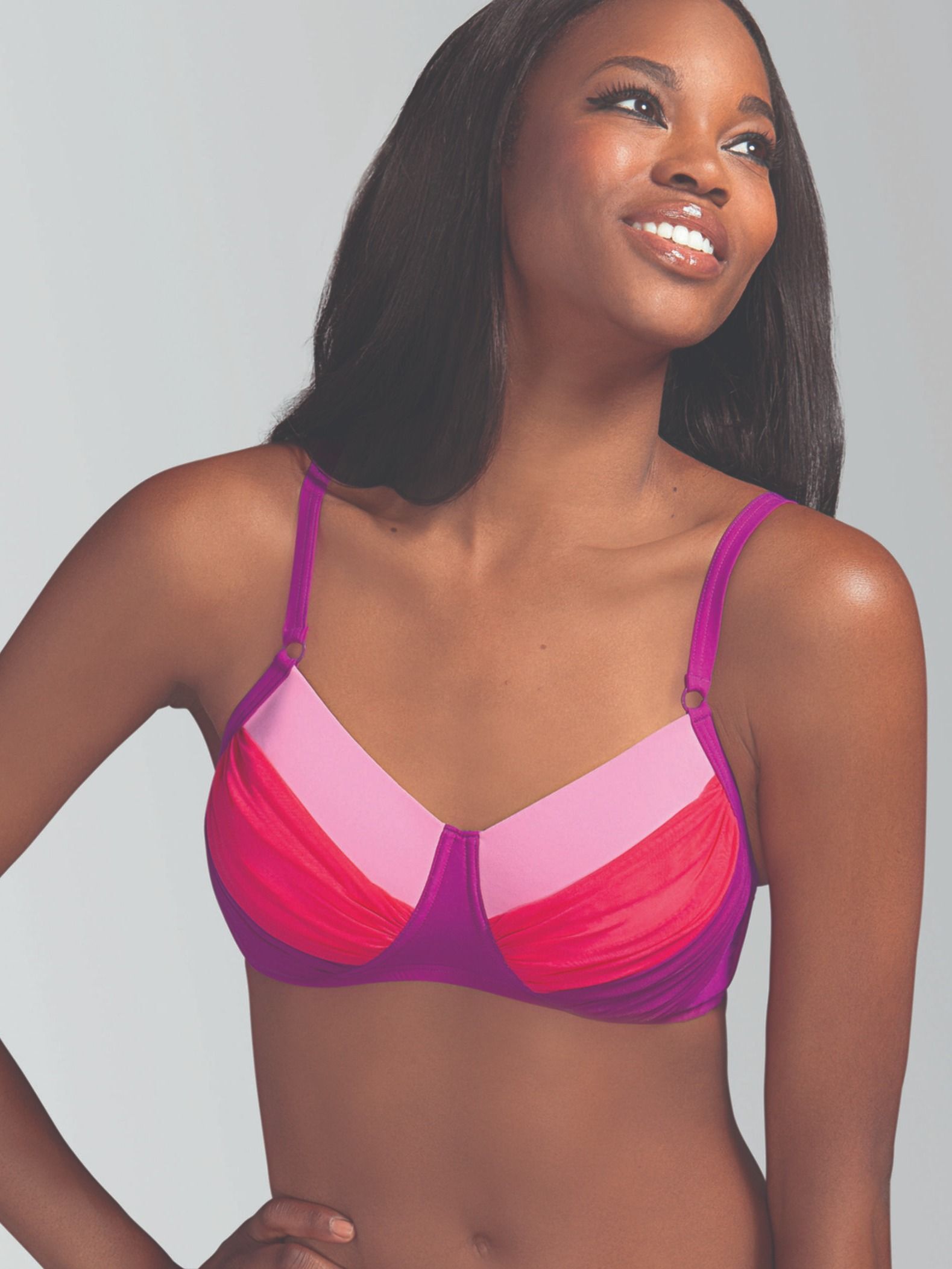 - Облегающее, высокое декольте в сочетании с эластичными материалами и тесёмками обеспечивает надежную фиксацию и поддержку, а также скрывает шрамы;