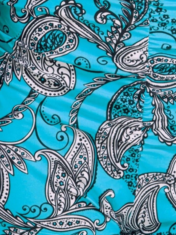 Дизайнерский орнамент "турецкий огурчик"на купальнике привносит некую самобытность образу, и отвлекает внимание на зону декольте.