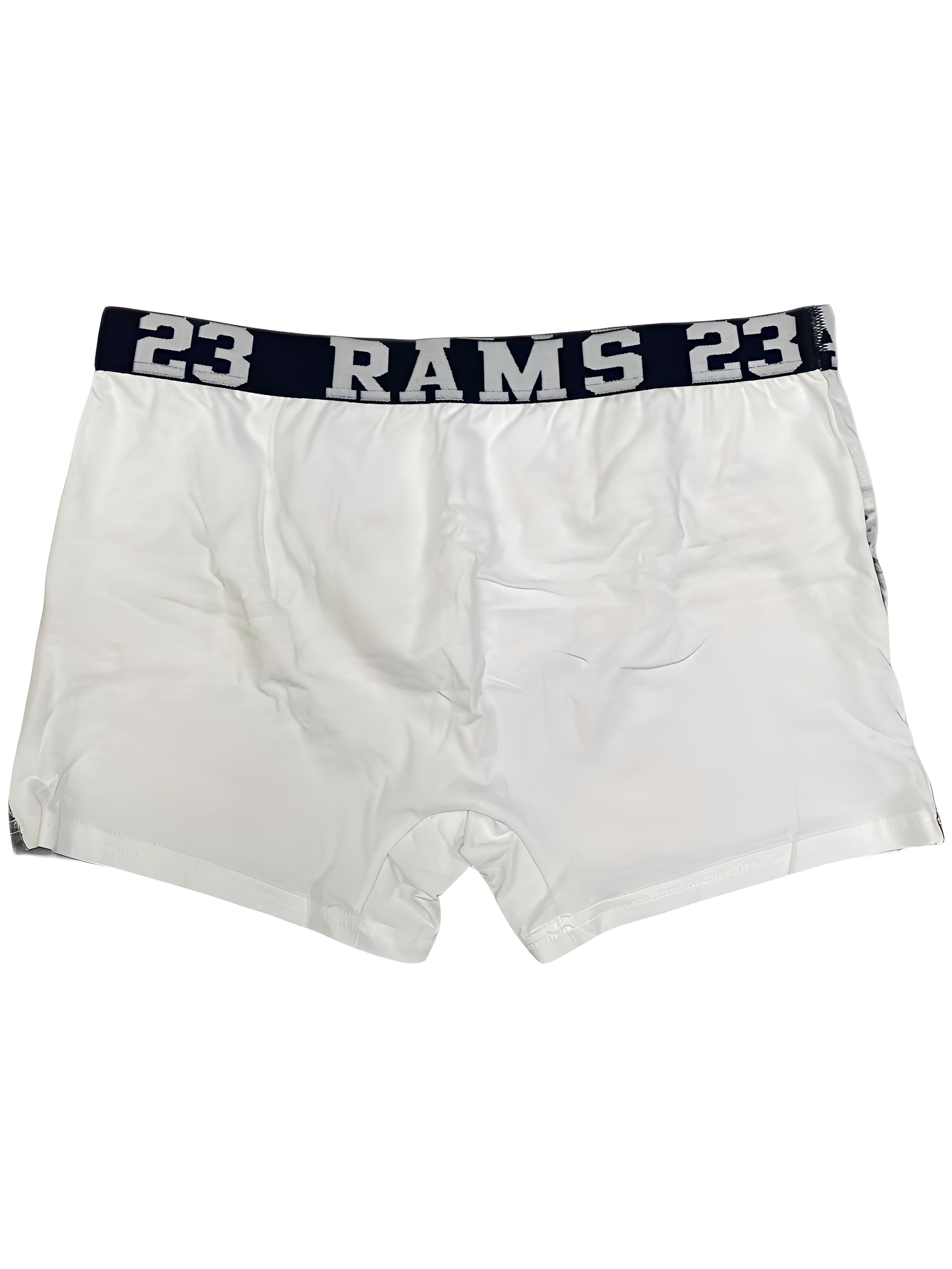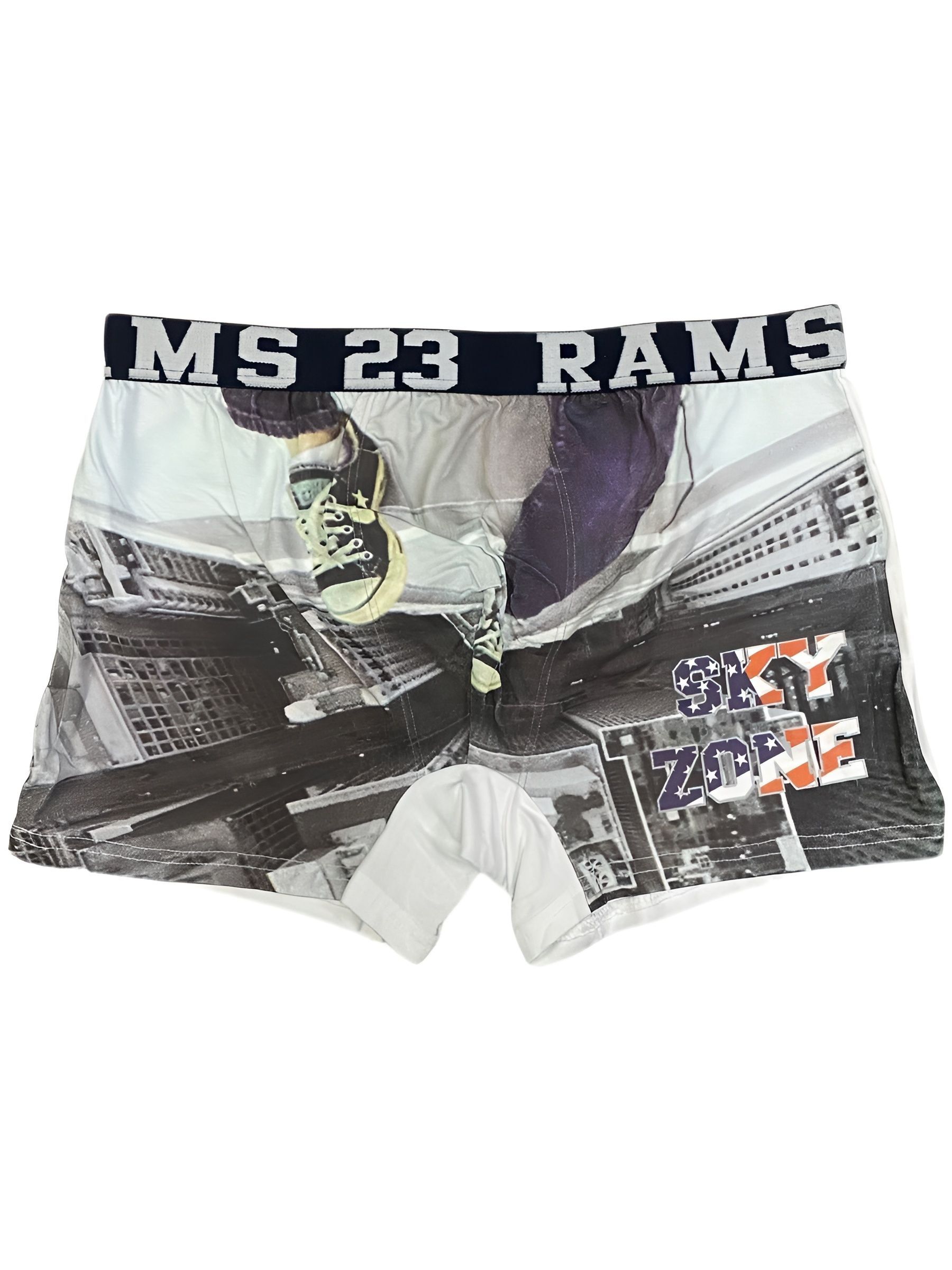 Дизайн: на эластичном поясе - широкой резинке темно-синего цвета выполнена брендовая печать белого цвета "RAMS23 PRIMAL".