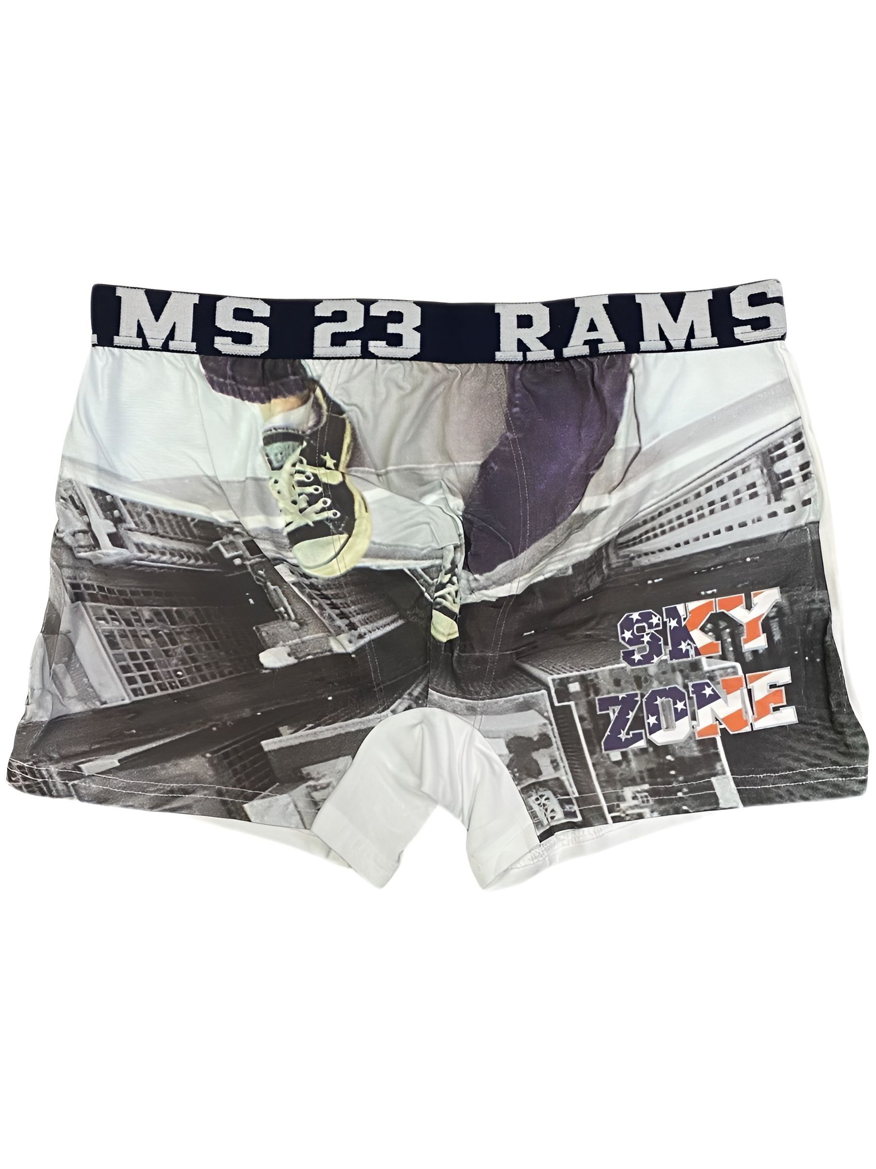 Дизайн: на эластичном поясе - широкой резинке темно-синего цвета выполнена брендовая печать белого цвета "RAMS23 PRIMAL".