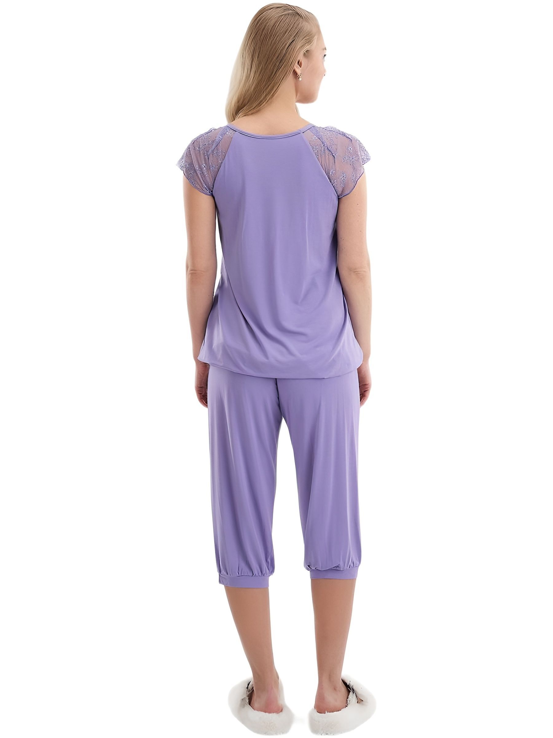 Кофточка с встроенным мягким бюстгальтером создает великолепную поддержку груди, рукава из эластичного кружева с растительным орнаментом придают романтический образ, а удобные брючки капри с эластичными манжетами ниже колена в полной мере отразят Вашу индивидуальность.