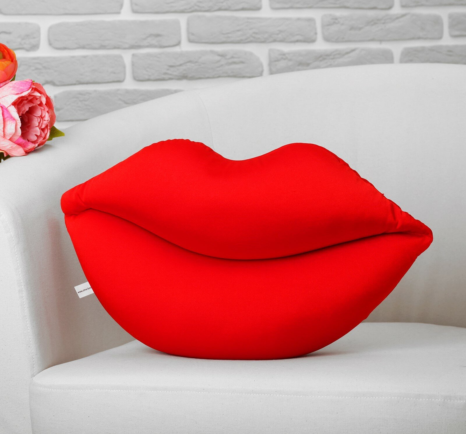 Подушка выполнена в форме алых, пылающих любовью губ, что делает ее прекрасным подарком на любой праздник, связанный с темой любви, сердца и счастья.