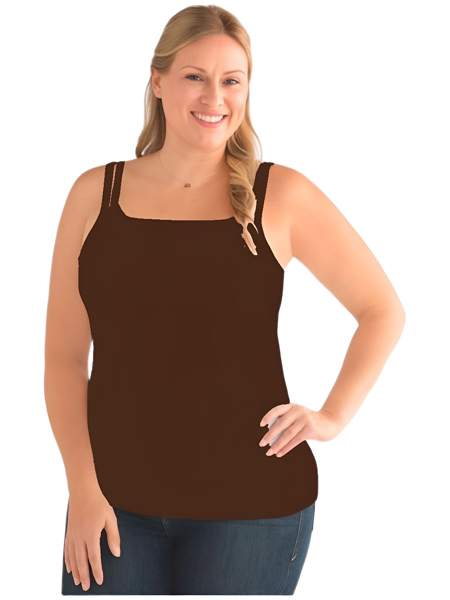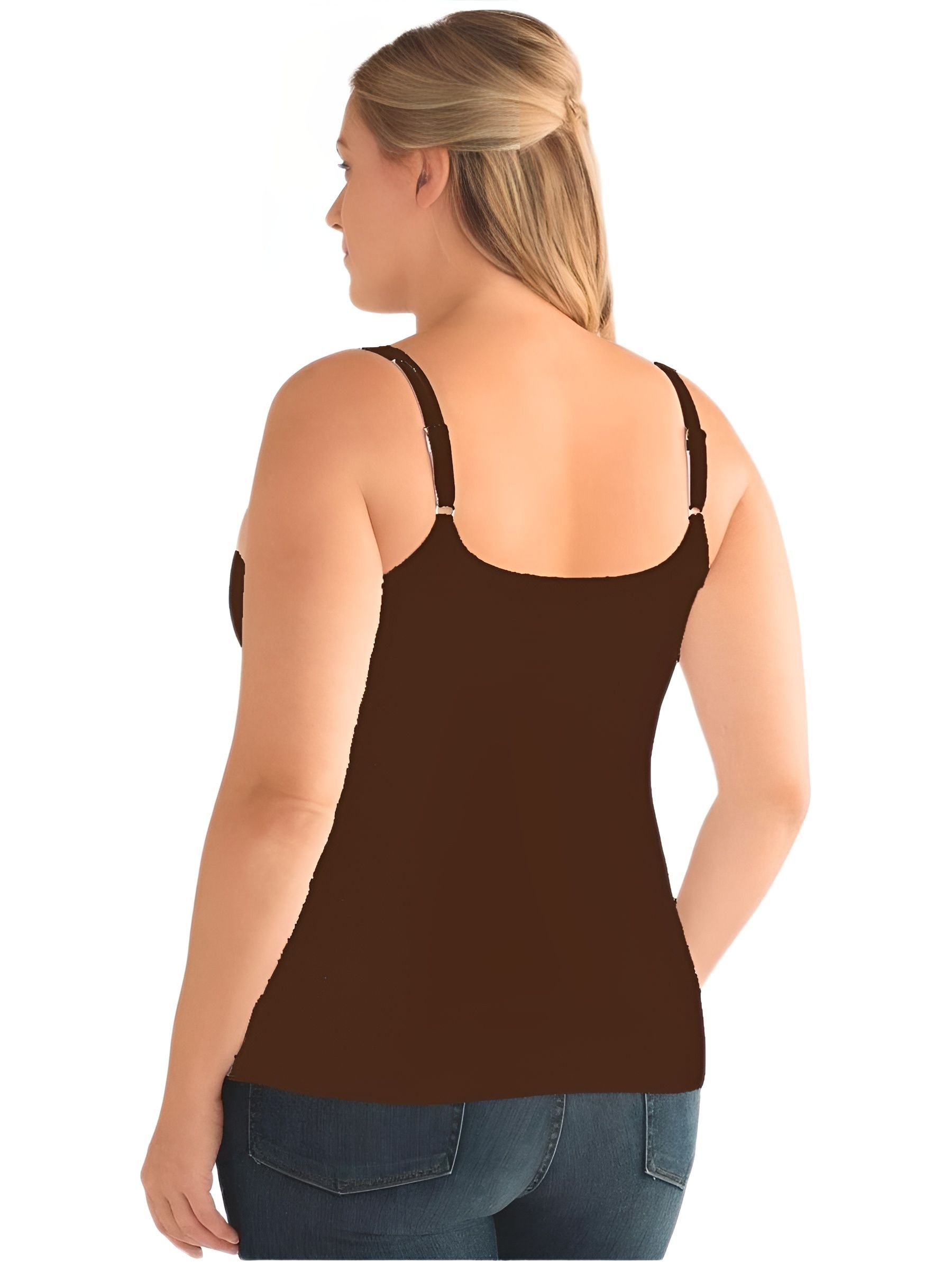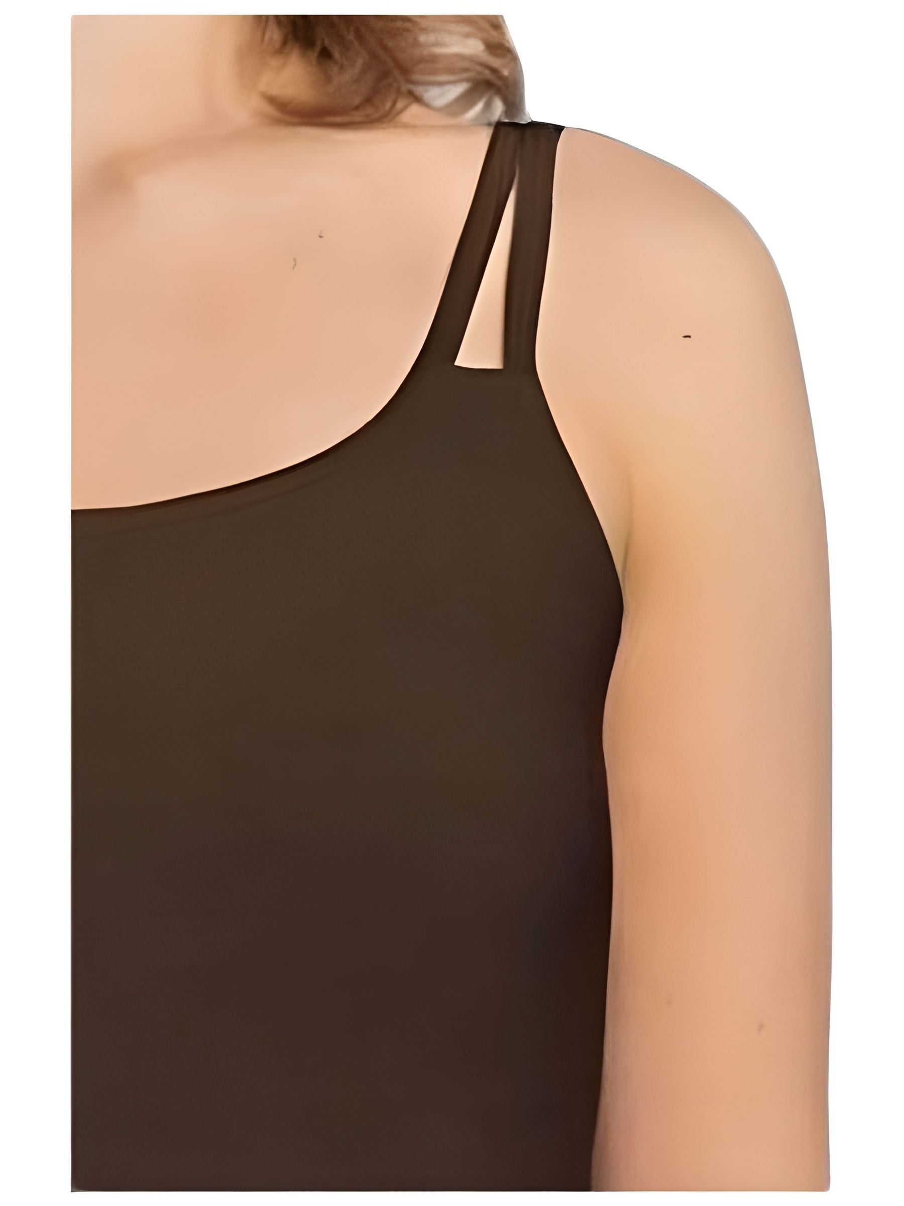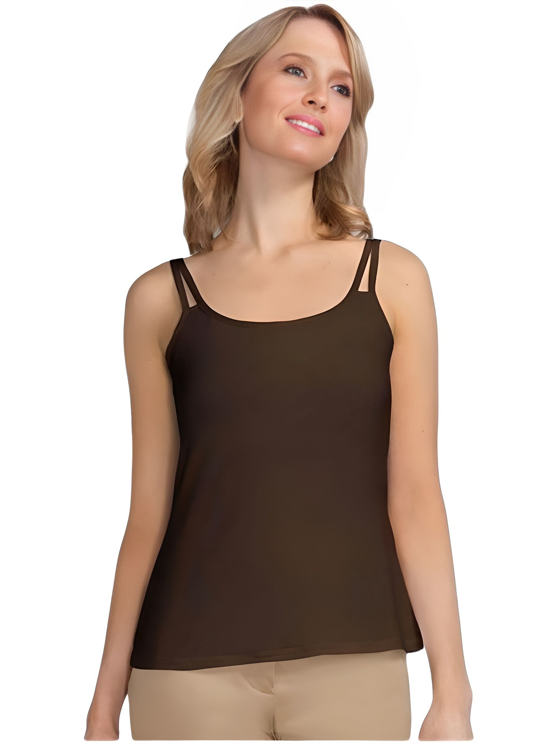 Элегантный легкий топ Valetta Amoena, цвет коричневый/горький шоколад, со вшитым бюстгальтером с кармашками, завышенной линией декольте и высокой проймой, отлично сидит на теле, подчеркивая талию и бедра.