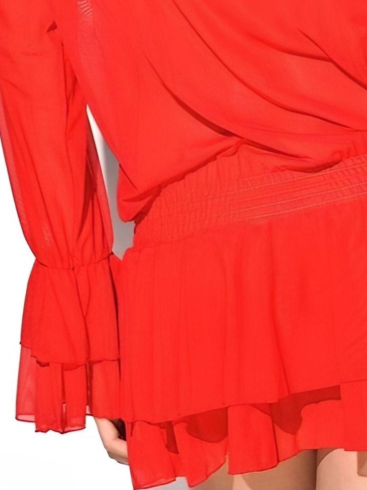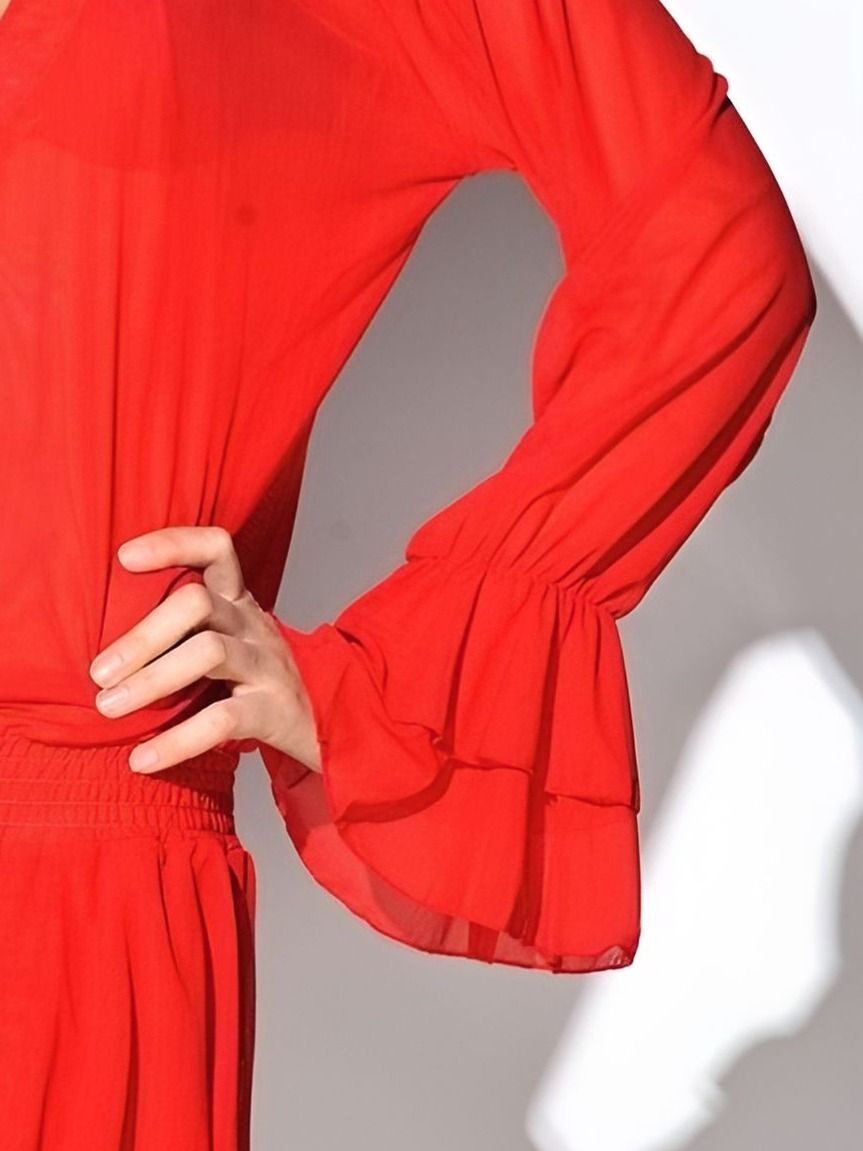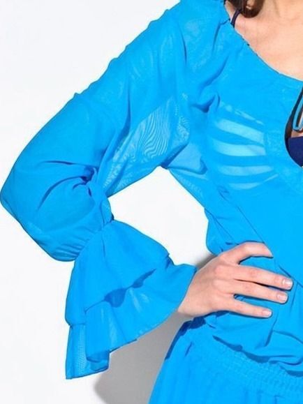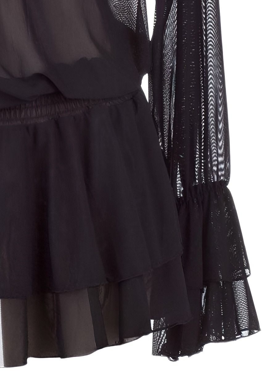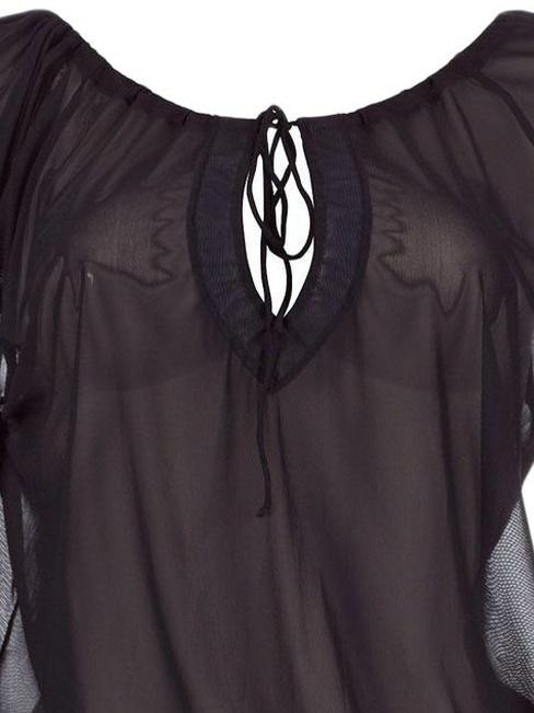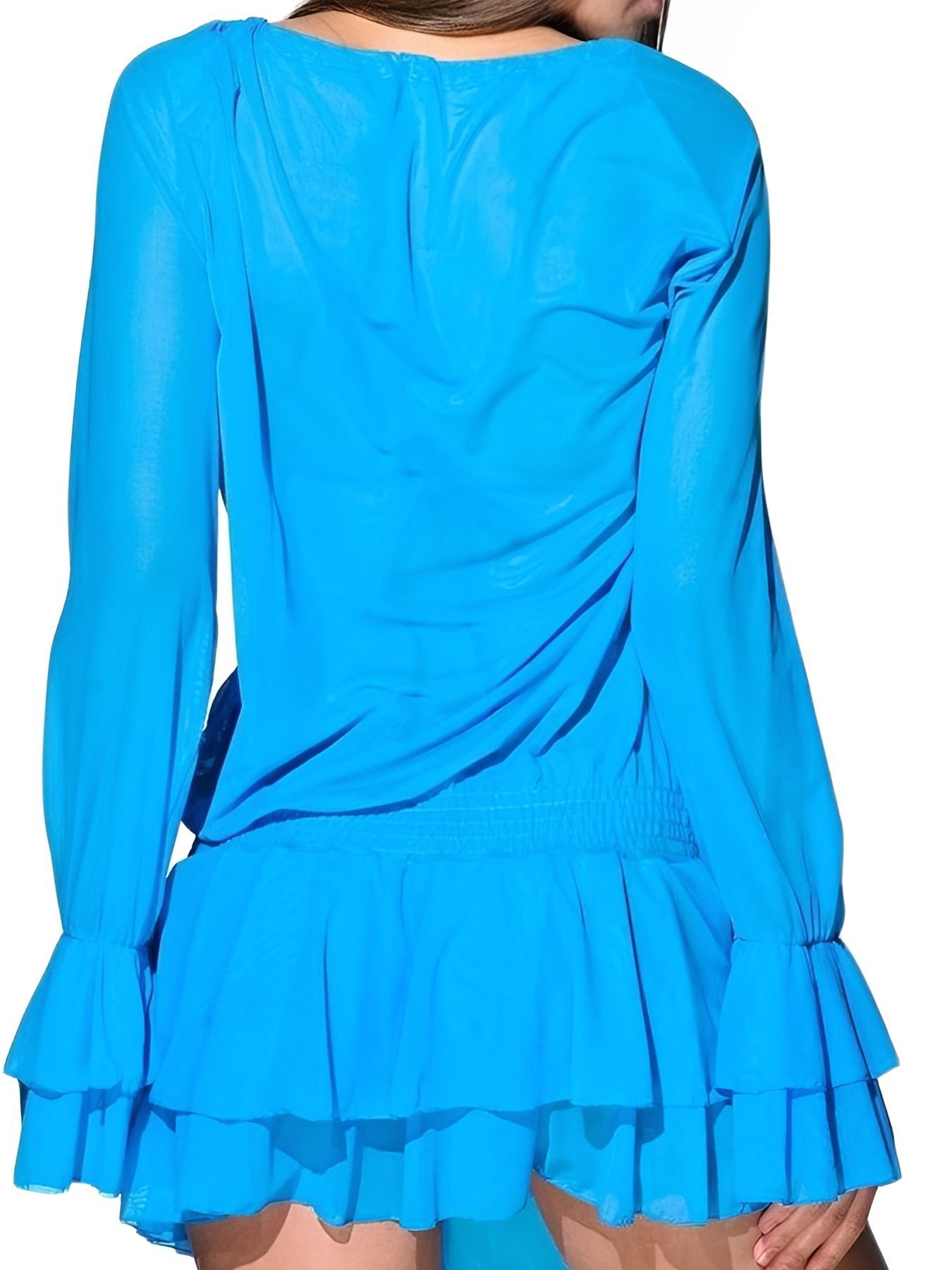 Туника выполнена с двойной оборкой по линии бедер, рукавами и оригинальным круглым воротом на завязках.