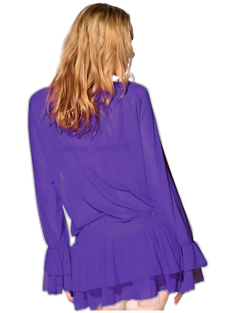 Туника выполнена с двойной оборкой по линии бедер, рукавами и оригинальным круглым воротом на завязках.