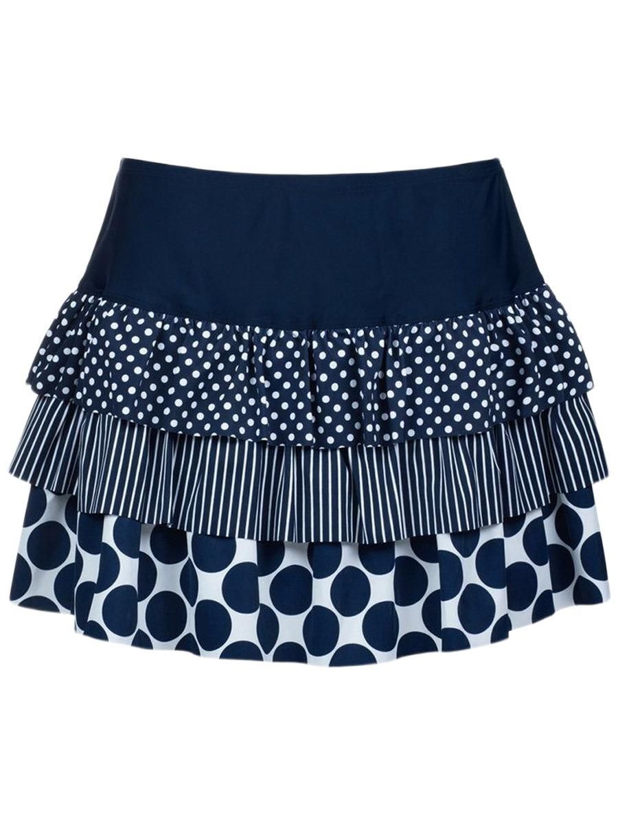 Исполнена в классической однотонной кокетке с тремя рядами густых воланов комбинированного типа из принтов компаньонов: всегда модного красно/белого гороха и эффектной красно/белой полоски.